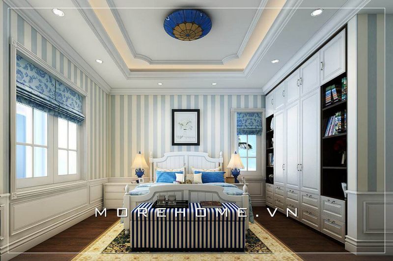 Mẫu thiết kế phòng ngủ bé trai hiện đại và tiện nghi với nội thất gỗ công nghiệp cao cấp và cách tạo các hình khối hình họa về nước pháp đẹp từ giấy dán tường ấn tượng cho phòng của con