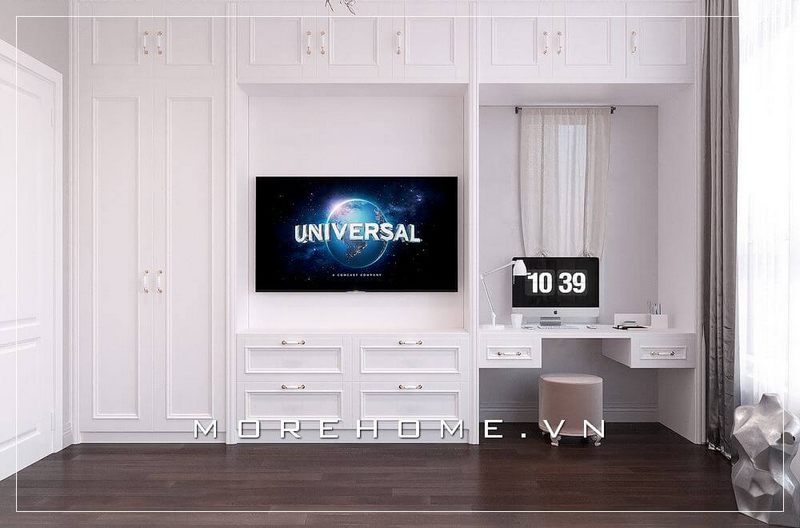 Mẫu kệ tivi gỗ màu trắng hiện đại cho phòng khách chung cư