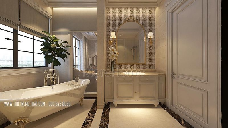 Tạo điểm nhấn cuốn hút cho không gian phòng tắm biệt thự với mẫu cửa gỗ màu trắng tân cổ điển
