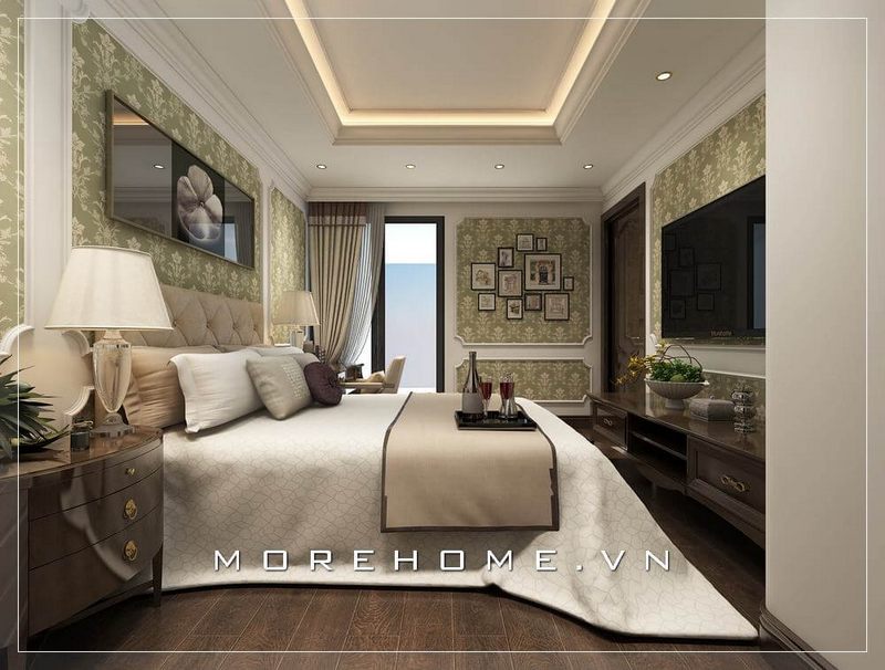 Mẫu thiết kế phòng ngủ Master tại chung cư cao cấp đầy ấn tượng, các vật dụng decor trang trí như giấy dán tường, giấy dán tường tân cổ điển, nội thất... tất cả tạo nên một bức tranh vô cùng hoàn hảo và tiện nghi