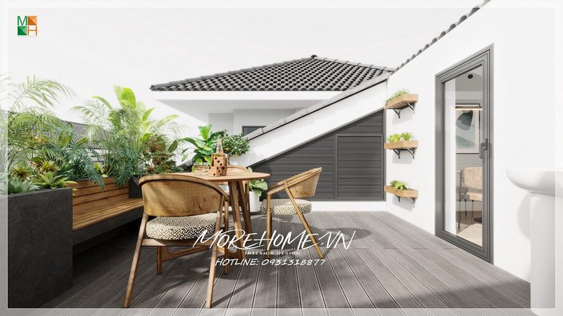 Kết nối không gian bên trong với sân thượng nhờ cửa kính 1 cánh hiện đại thông thoáng nới rộng kết nối gần gũi lại với 2 không gian