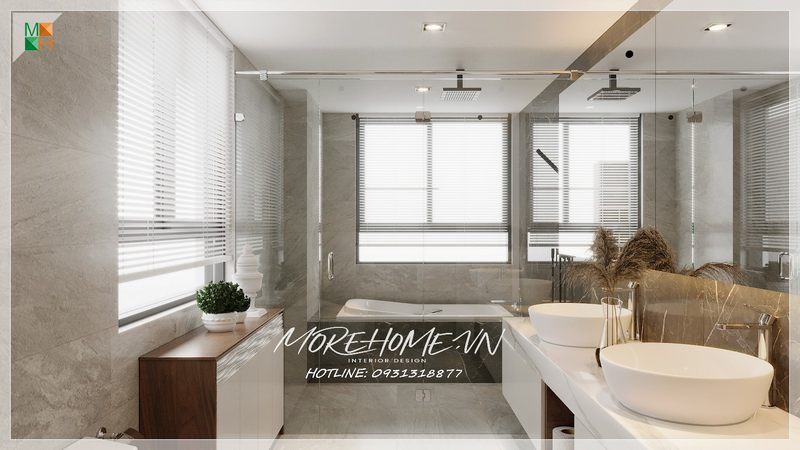 Mẫu phòng tắm hiện đại được bố trí với 2 lavabo rửa mặt và tủ đựng đồ tiện lợi, giúp bạn có những phút giây thư giãn sảng khoái.