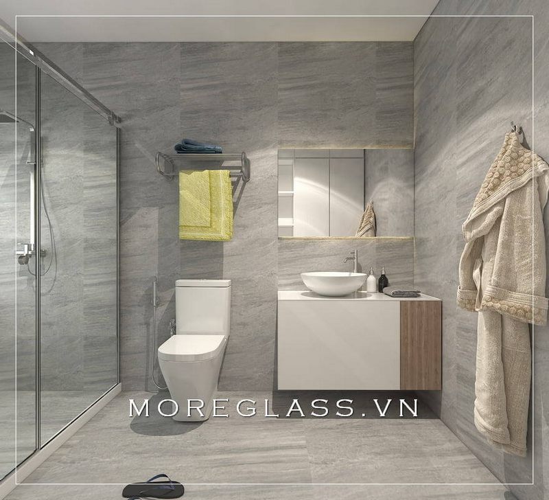 Mẫu thiết kế của nhà tắm và nhà vệ sinh sử dụng kính cường lực để tạo nên vẻ đẹp tinh tế và sang trọng.
